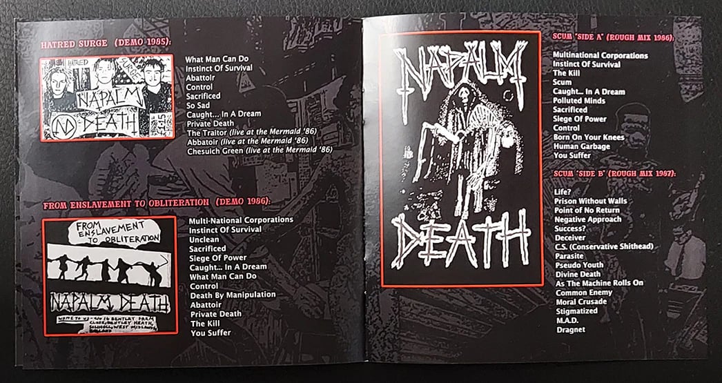 A compilation of their first two official demo tapes «Hatred Surge» and «From Enslavement To Obliteration» as well as the rough mixes from their debut album «Scum».
